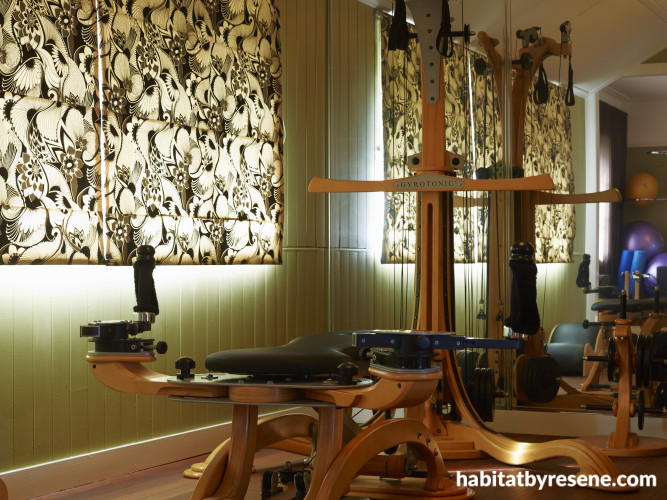The pilates studio with its Resene Avocado walls and trims in Resene Alabaster. The blinds are in a Florence Broadhurst ‘Aubrey’ fabric.
