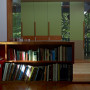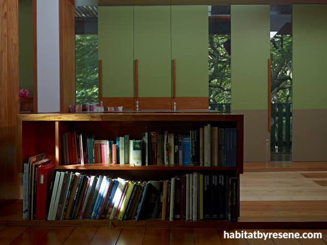 Further opportunity to combine beautiful furniture with function was made with this bookcase, which acts as a divider between the living area and dining space, and the reverse of which is used to house china and glassware. Rosewood timber is used alongside panels in Resene Woodstock (green) and Resene Double Napa.
