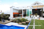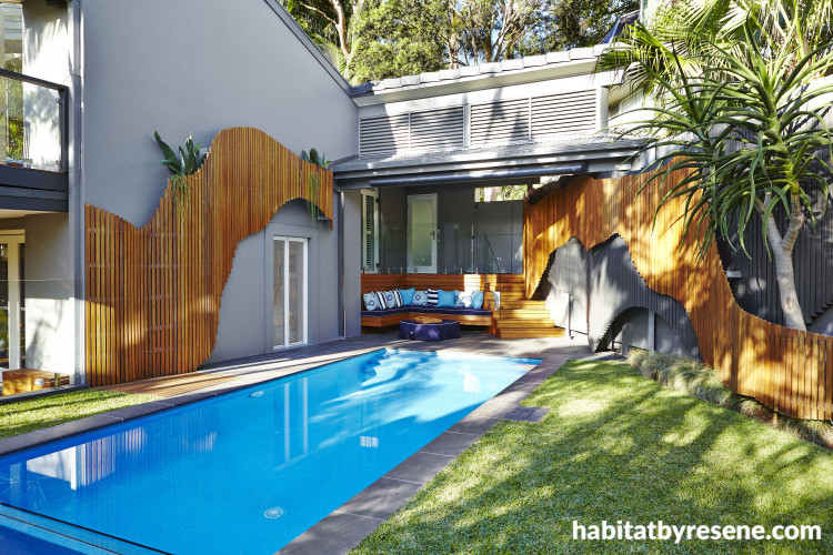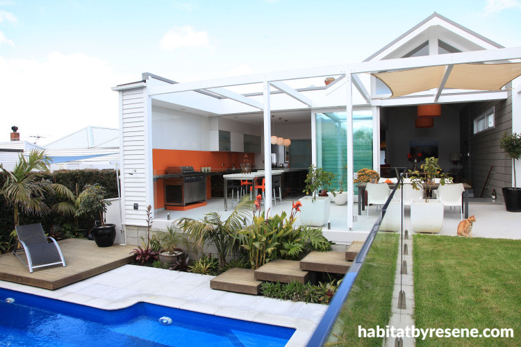 Gary and Phil's sizzling garden: the rear garden has been divided into three distinct zones – the wide terrace, the pool and the lawn. The house weatherboards are finished in Resene Sea Fog with trims in Resene White.