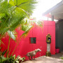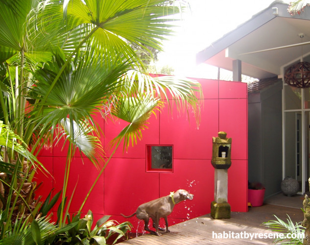 The colour selection wasn’t all about earthy colours. Michelle added an intense burst of Resene Vibe, a cheeky pink/red, at the front of the house to counter the lack of light from thick palms and define the entry.