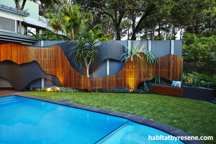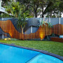 The transformation began by replacing the decking around the pool with grass and resurfacing the pool. The brief for ‘something different’ was the design challenge. Faced with the two tall blank canvasses of the fence and wall, Antscapes developed the screens, which twist across the wall and fence which were repainted in a specially mixed Resene Quarter Dune. One of the screens is left in natural blackbutt, while the other is painted in Resene Triple Dune – a colour which echoes the tone of the new bluestone edging around the pool. Plants cascade through the screens supported by hidden irrigation and drainage.