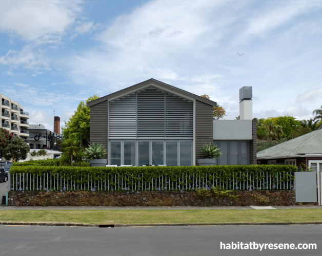 Resene Double Mondo was chosen for the home's exterior, which is complemented by Resene Sea Fog window frames and slats, and accessorized with giant potted succulents.