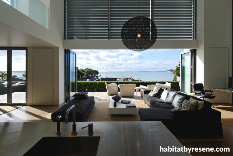 Self-confessed "white paint freaks", the owners went for an all-white Resene Sea Fog interior, but to keep with the boat shed theme, they used brown Resene Double Mondo for the exterior. The furniture, fittings and fabrics are almost entirely white, black and stainless steel. A breathtakingly high ceiling, which is floor-to-ceiling glass on the ocean side, is the main focus. The upper half of this glass features large louvres that are electronically controlled from the mezzanine-floor master bedroom. "We can close the louvres at night, but we tend to keep them open because the view of the sky and ocean at night is so beautiful," says one of the owners.