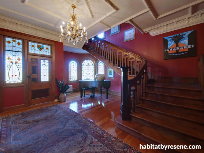 When Andy and Julie bought it ten years ago, they were attracted by the high studs, stained glass, sweeping staircase, and the quality of the house's construction, and decided to restore it to its former glory - albeit with all the comforts of modern living. These days, the six-bedroom home features Italian chandeliers, a huge kitchen, tennis court, swimming pool, summer house and stables.