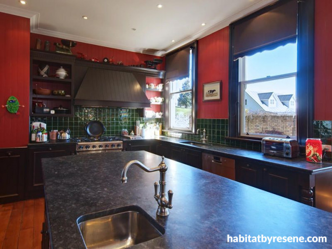 What colours did you use? In the kitchen and family dining room we used Resene La Bamba, while the red in the entrance hall is Resene Red Red Red. The family living area is Resene Surf Crest. We used Resene Quarter Spanish White for the exterior of the house.