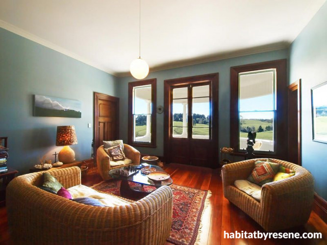 Andy and Julie say the living areas are their favourite spaces in the house because they are "spacious and comfortable and feel 'lived in'." This one is painted in Resene Surf Crest.