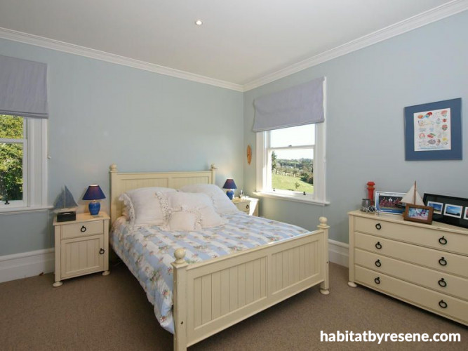 One of the bedrooms, painted in Resene Link Water, has a slight nautical theme. The pale colour helps the room to look fresh and light.