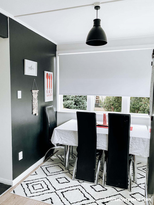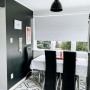 The sophisticated dining room is brought into focus with a feature wall in Resene Blackjack that provides contrast against surrounding walls in Resene Eighth Rice Cake and ceiling and trim in Resene White.