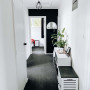 The hallway continues the homes colour scheme with Resene Eighth Rice Cake walls, ceiling and trim in Resene White and a feature wall in Resene Blackjack.