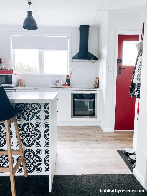 The family’s colourful kitchen pops with Resene Red Berry on the back door and an intricate stencil on the kitchen island in Resene Blackjack. The walls are in Resene Eighth Rice Cake and the ceiling and trim are in Resene White.