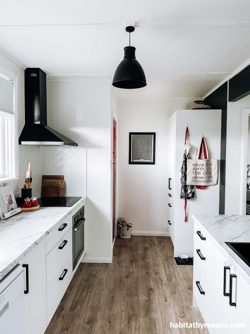 After discovering she was pregnant with Oliver soon after beginning home renovations, Joanne says it was a challenge trying to renovate with a baby. The first lockdown gave her a brief reprieve, allowing her the chance to finalise her colour palette and get fully stuck into painting. “I have always loved the contrast of black and white,” says Joanne. “We wanted to brighten up the interior with white Resene Eighth Rice Cake with Resene Blackjack as a secondary colour and splashes of Resene Red Berry as an accent colour.