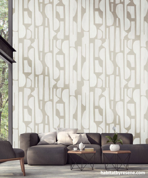 For a touch of drama in a room with a high ceiling, try an oversized pattern like Resene Wallpaper Collection E395895 paired with flooring stained in Resene Colorwood Mid Greywash and finished with Resene Aquaclear.
