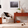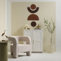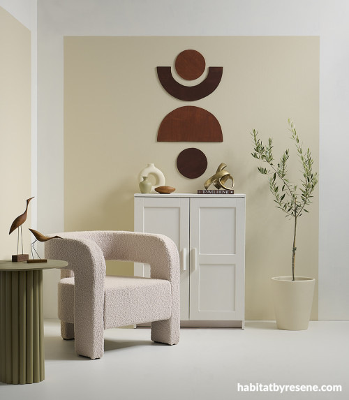 The rich cream of Resene Double Spanish White is framed with borders of Resene Eighth Spanish White with Resene Quarter Spanish White. The cabinet is also in Resene Quarter Spanish White and the plant pot is in Resene Double Spanish White. The wooden wall art is stained in Resene Colorwood Meranti and Resene Colorwood Dark Oak. The tall table is in Resene Clay Creek. Project by Melle van Sambeek, image by Bryce Carleton.