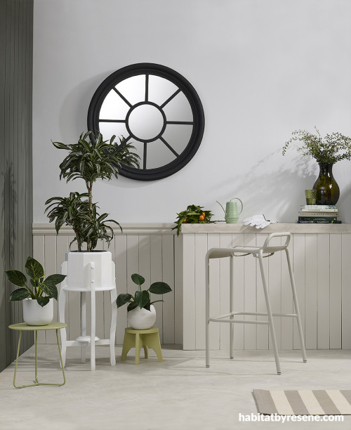 Bursts of black and charcoal in Resene Quarter Karaka on the left wall and a Resene Nero mirror, are given added impact by different strengths of a neutral. The top of the rear wall is Resene Double Merino, while the lower panel is in Resene Quarter Merino. The bench top is Resene Quarter Merino with Resene FX Paint Effects medium mixed with Resene Foggy Grey. The white planter painted in Resene Enamacryl tinted to Resene Quarter Merino. The small plant stand is Resene Quarter Crisp Green. Project by Kate Alexander, image by Bryce Carleton.