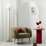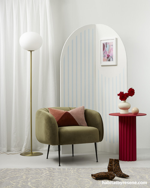 Resene Half Alabaster walls and flooring in Resene Rakaia create a cool, sophisticated backdrop to bolder shades. An arch in Resene Half Alabaster with stripes in Resene Pattens Blue adds visual interest. The tall side table is in Resene Code Red and the case is in Resene Pale Rose. Project by Melle van Sambeek, image by Bryce Carleton.