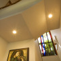 The stained glass window in the stairwell brings colour and light into the space.