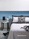 Walls in Resene Black White with a Resene Frozen headboard transform this bedroom into a soothing retreat. The bedside table is in Resene Cut Glass and Resene All Black, with vases in Resene Quarter Alabaster and Resene Cut Glass. Project by Claudia Kozub. Image by Melanie Jenkins.