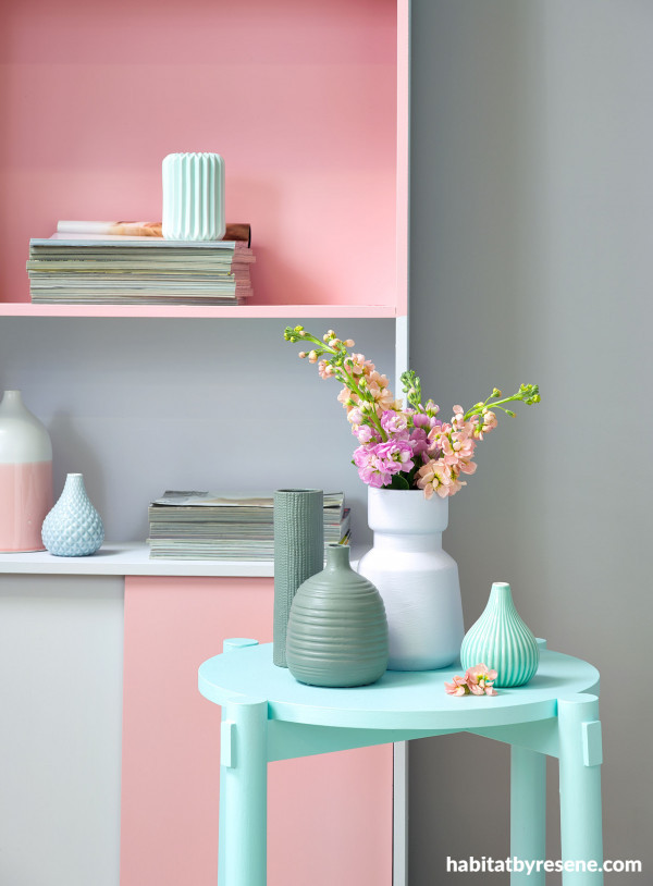 The perfect pair; pink and grey shine in this storage nook with a wall in Resene Rakaia and asymmetric shelving units in Resene Sweet Spot and Resene Seashell. A splash of vibrant blue Resene Reservoir colours the side table. Project by Claudia Kozub. Image by Melanie Jenkins.