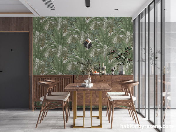 In this dining room, a floral and wood design are paired together seamlessly with their neutral tones. Resene Botanica Wallpaper Collection 33951 (left) and Resene Botanica Wallpaper Collection 33957 (right) add interest and texture to the space. Pair these wallpapers with light hues using Resene Half Merino, Resene Eighth Joss, Resene Quarter Linen, and even a light wood stain for added texture like Resene Colorwood Whitewash.