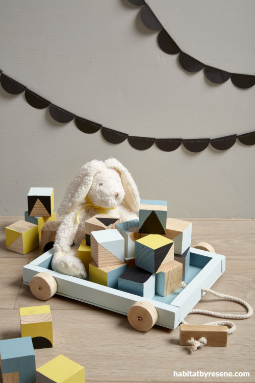 Make a set of play blocks and a trolley to put them in. Little Treasures magazine shows you how in the latest issue, on sale now. The colours used here are Resene Reservoir